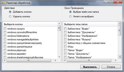 Режим пакетной обработки, позволявший добавлять/удалять кнопки из нескольких типов папок одновременно, работал так: