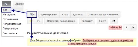 Иногда поиск или метка выводят больше писем, чем помещается на одну страницу. Когда вы выбираете все письма, выделяются только те, что видны. Но Gmail при этом предлагает выбрать все цепочки, удовлетворяющие критерию поиска или имеющие метку.